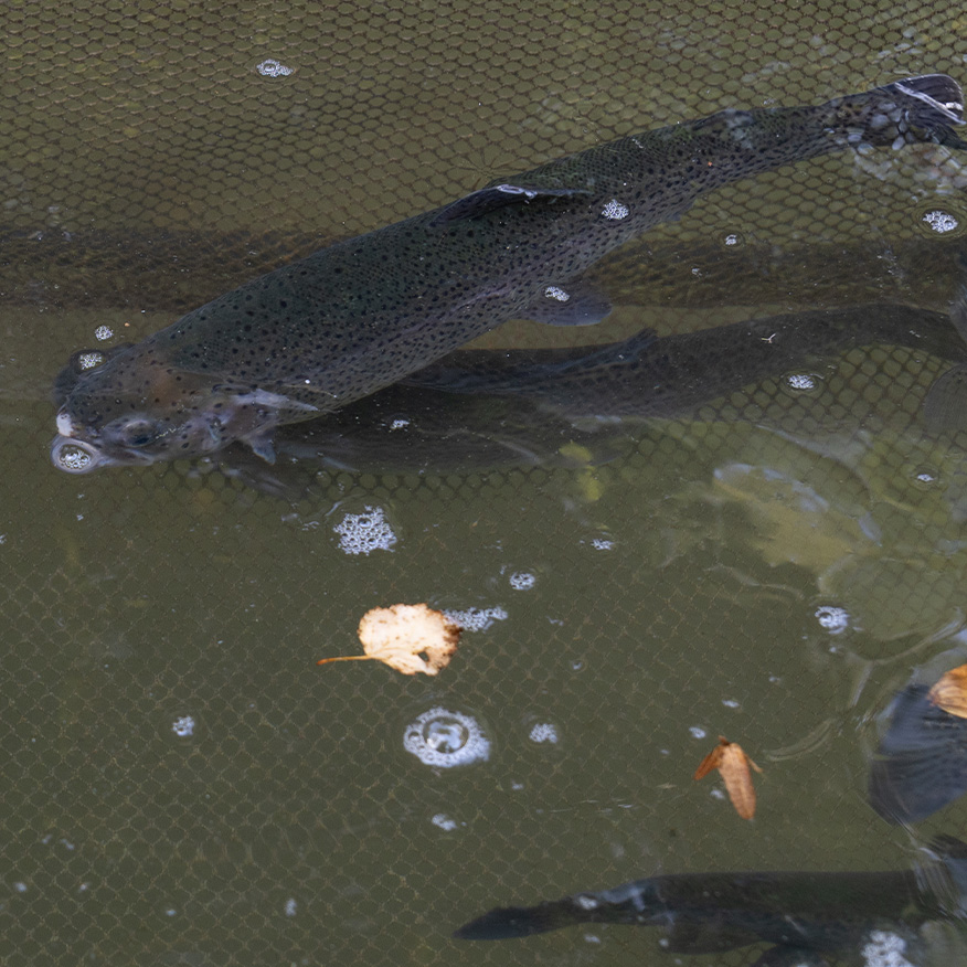 Frischer Fisch aus eigener Aufzuch (Forelle, Lachsforelle, Karpfen und Saibling) sowie selbst geräucherter Fisch (Aal, Forelle, Lachsforelle, Saibling, Stremel, Karpfen).