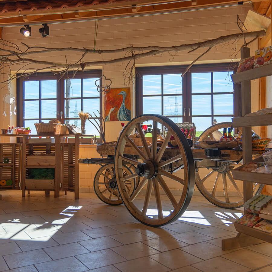 Wer Lust auf eine Stärkung hat, der kann im Hofladen frischen Kaffee und Kuchen in Bio-Qualität erstehen und sich auf den Sitzgelegenheiten unter den Sonnenschirmen vor der Hofscheune entspannen.