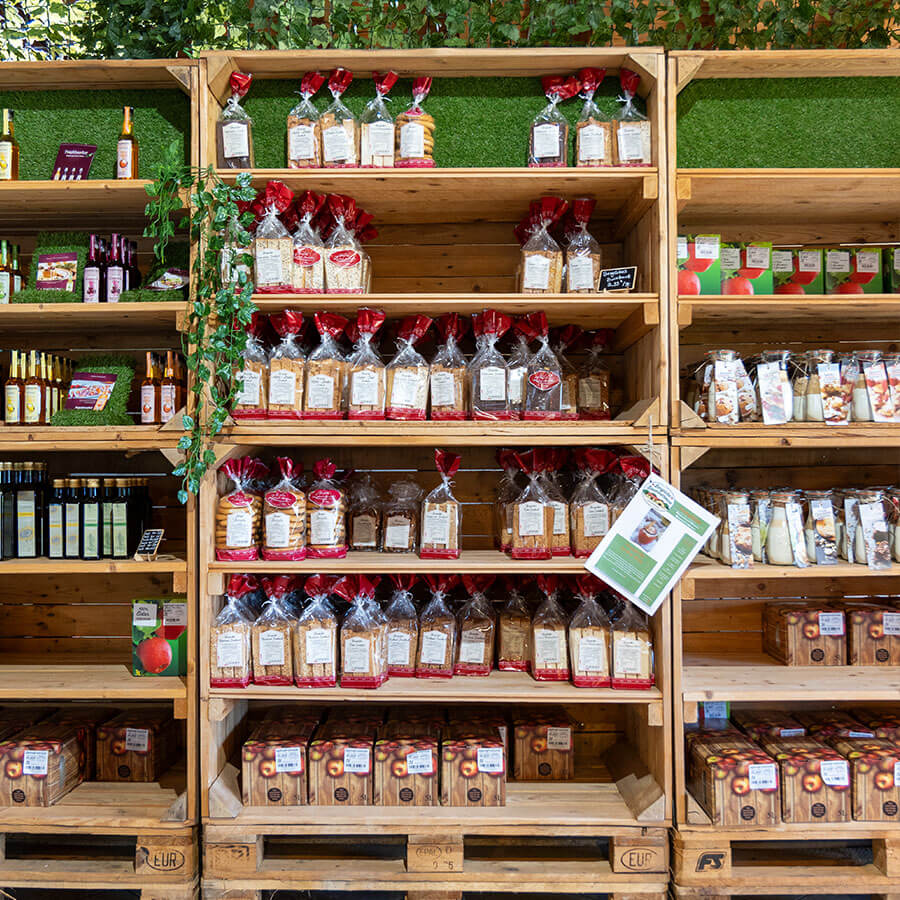 Der Hofladen bietet eine breite Produktpalette regionaler Lebensmittel lokaler Hersteller*innen. Von Obst und Gemüse über Marmeladen, Weine und Schnäpse, Pasta, verschiedene Fleisch- und Wurstwaren, Käse und sonstige kulinarische Köstlichkeiten ist hier für alle etwas dabei.